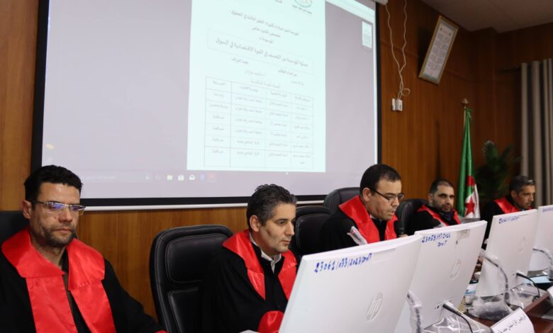 جانب من مناقشة أطروحة الدكتوراه التي جرت يوم الخميس 16 أفريل 2026 الموسومة ب:” حماية المؤسسة من التعسف في القوة الاقتصادية في السوق ” من إعداد الطالب غزالة محمد تحت إشراف البروفيسور شايب بوزيان أمام لجنة المناقشة المكونة من: